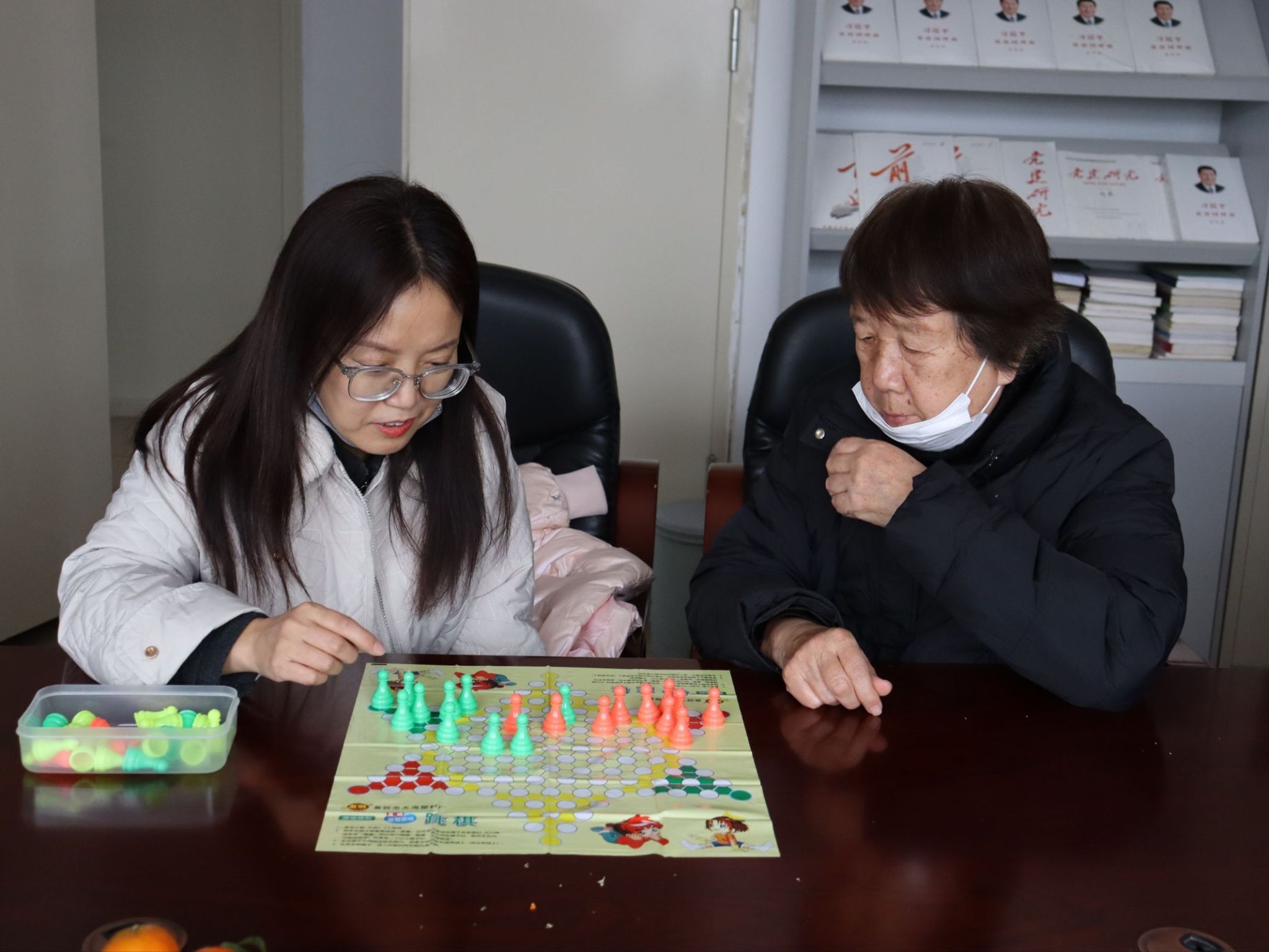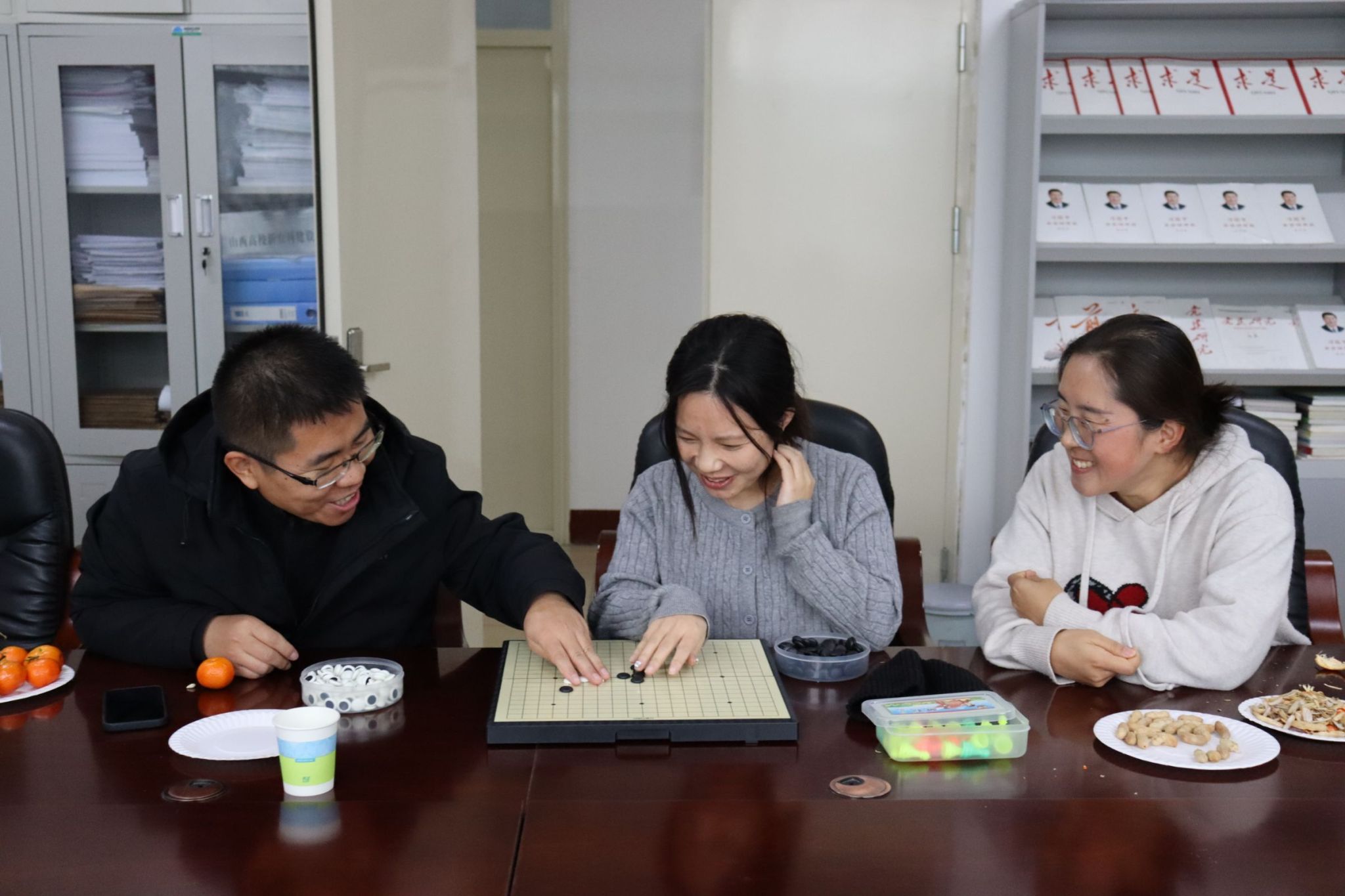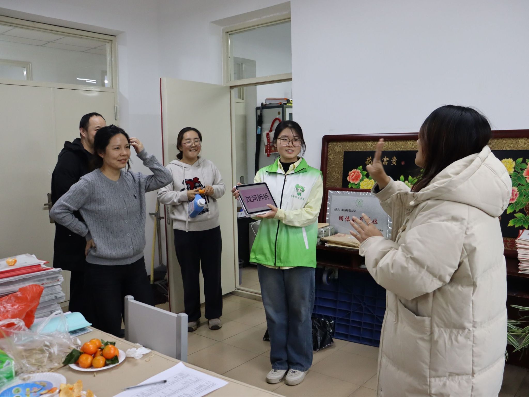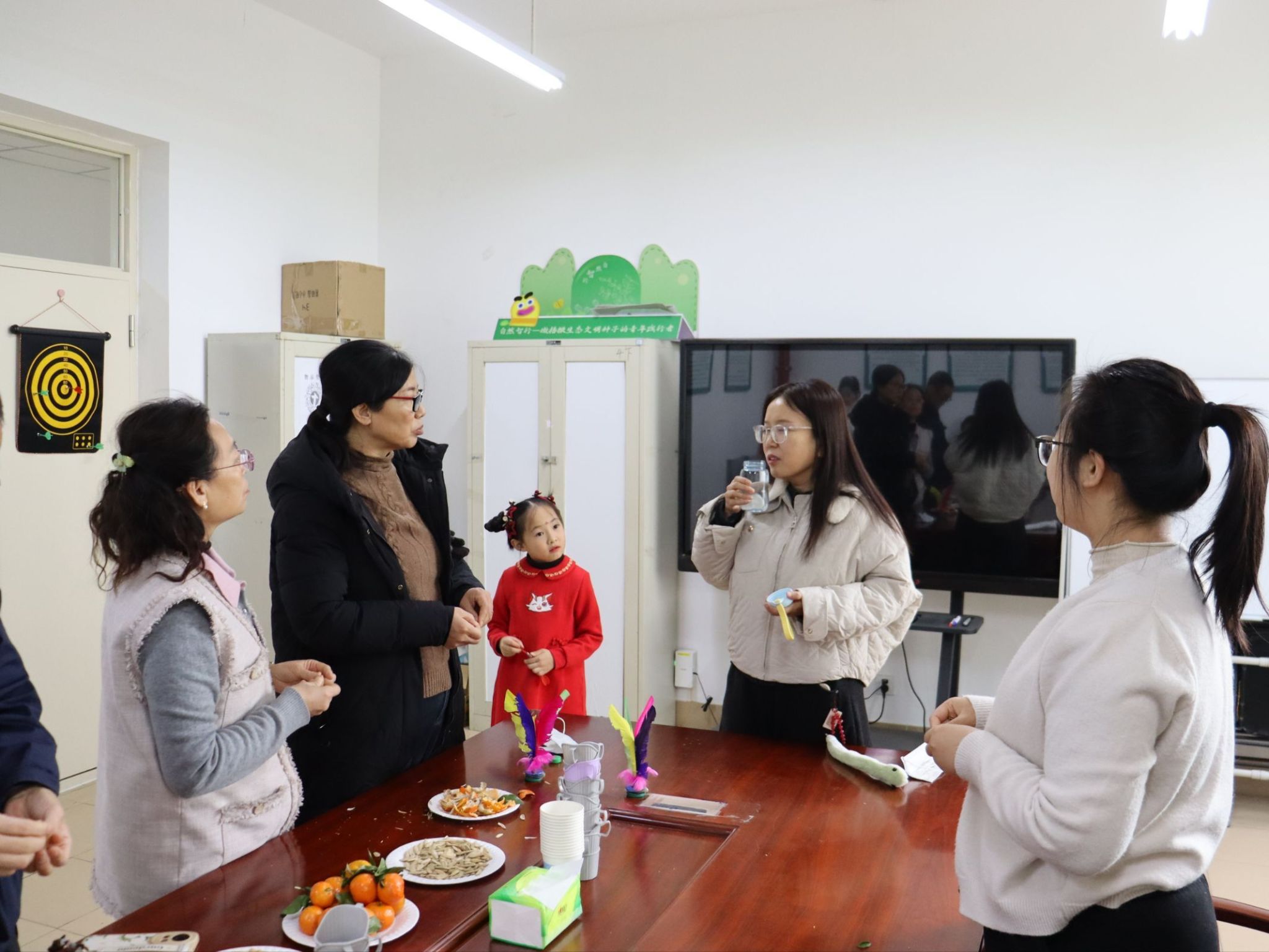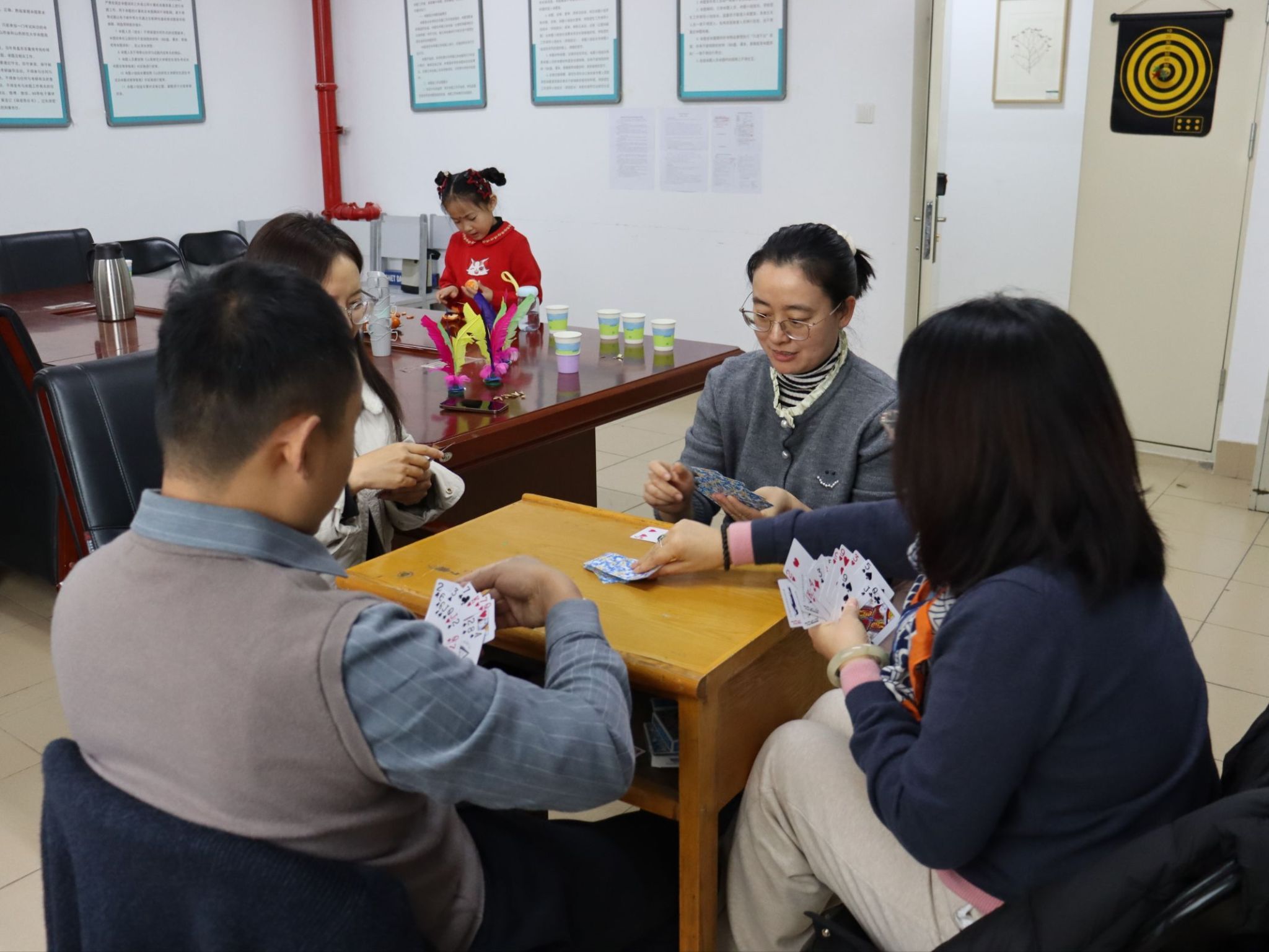 活动伊始,办公楼内便充满了欢声笑语。飞镖靶前,大家凝神聚气,手腕轻转,一道道弧线划过空中,每当镖尖稳稳扎入靶心,周围便响起一片叫好与欢笑。棋牌区内,五子棋棋盘上黑白交错,落子声清脆,对弈双方时而沉思布局,时而果断出击,方寸之间尽显智慧碰撞。扑克牌桌旁气氛同样热烈,出牌声、商讨声、欢笑声交织成一片,默契的配合与出其不意的策略让每一局都充满乐趣。最引人注目的是“你比划我猜”环节,比划者手脚并用,形象演绎,猜词者反应敏捷,妙语连连,生动滑稽的互动,将气氛推向高潮。运动角里,毽子在空中灵巧翻飞,划出一道道欢快的轨迹,老师们身形轻盈, 动作行云流水,踢接转折间透出从容与灵巧。各活动区域气氛轻松融洽,教职工们在各类项目中放松身心,共同迎接崭新的一年。
