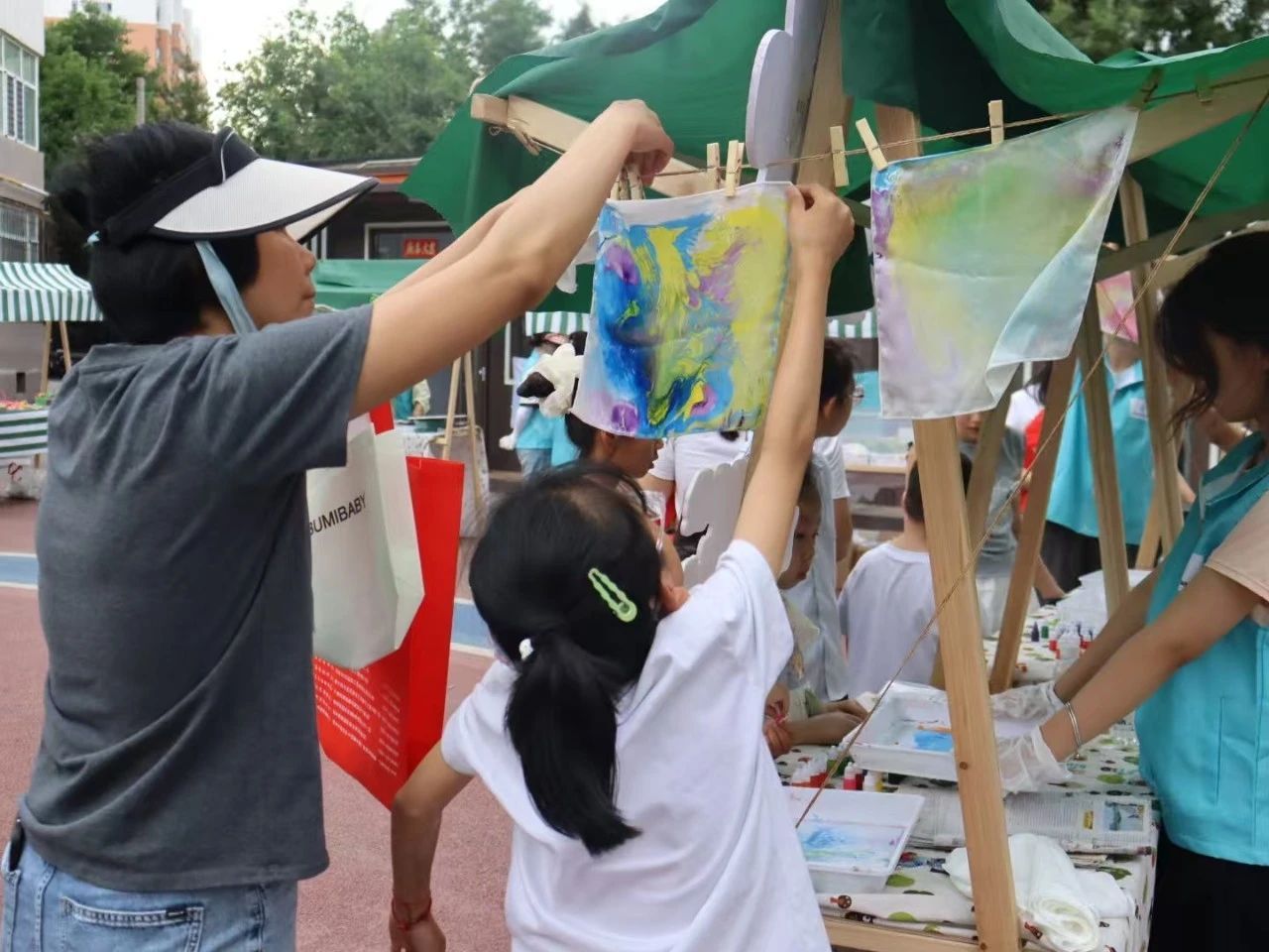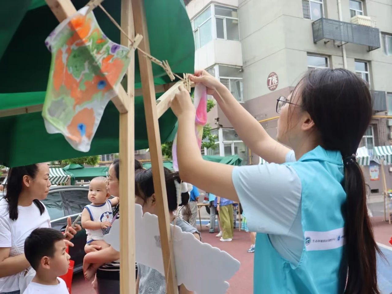在旧物漂流市集上,社区居民们带来了家中的闲置物品,如书籍、文具、玩具等。居民们将自己所带的物品以物易物或免费赠送的方式,将物品传递给下一个需要它的人。零废弃生活体验区是活动的另一大亮点。居民们在志愿者的指导下,使用家中不再穿的旧衣物或布料,进行拼布画的创作。这个过程不仅让居民们体验到了手工制作的乐趣,也让他们意识到废旧物品的再利用价值。在植物染料水拓丝巾的制作活动中,大家利用天然植物染料来进行染色,制作出了独一无二的水拓丝巾。在这个活动中,居民们学习到了如何使用天然植物染料来染色。此外,还有咖啡渣、茶渣等废弃物的循环利用体验,让居民们了解到这些看似无用的物品在生活中的多种妙用。