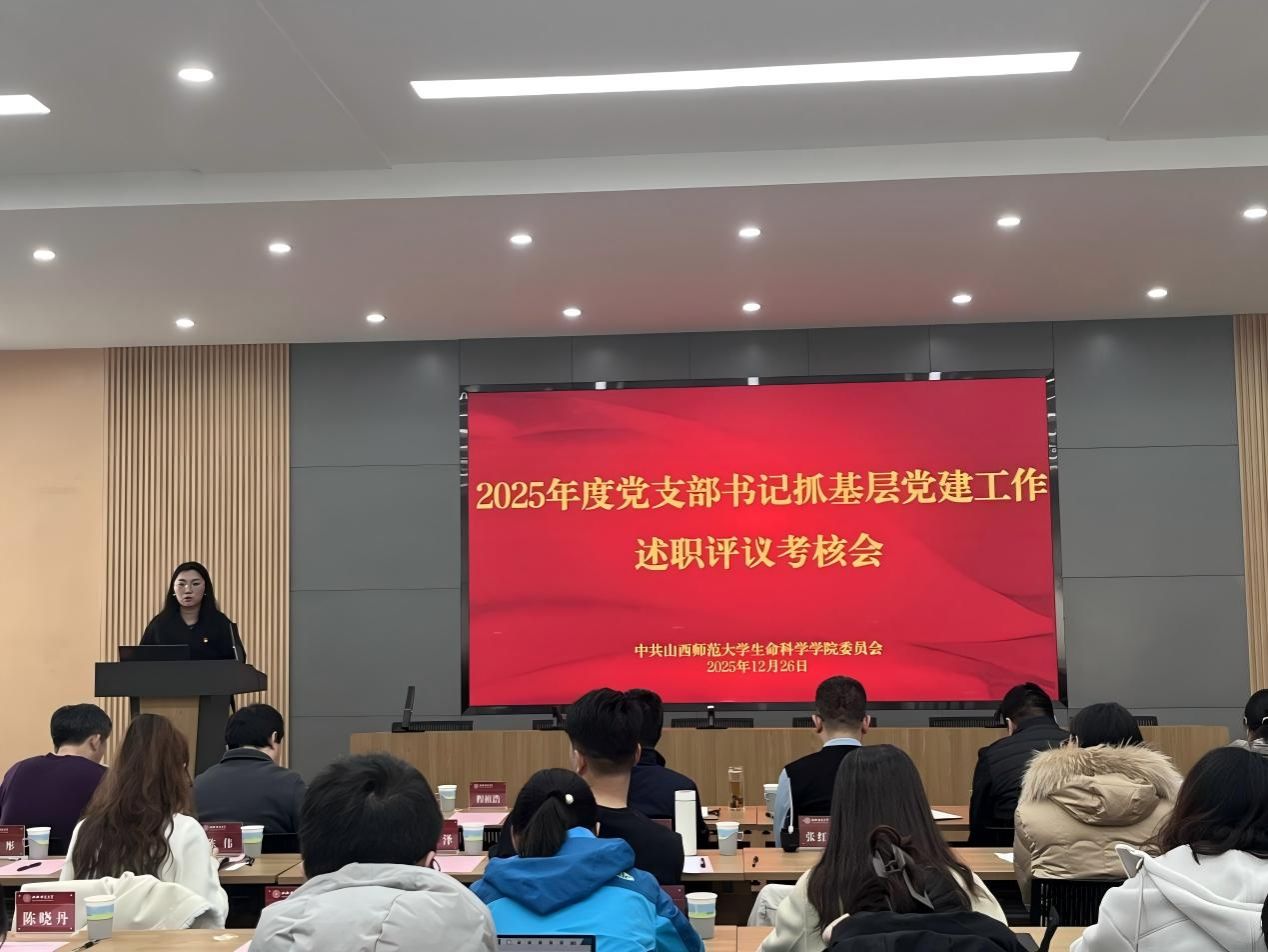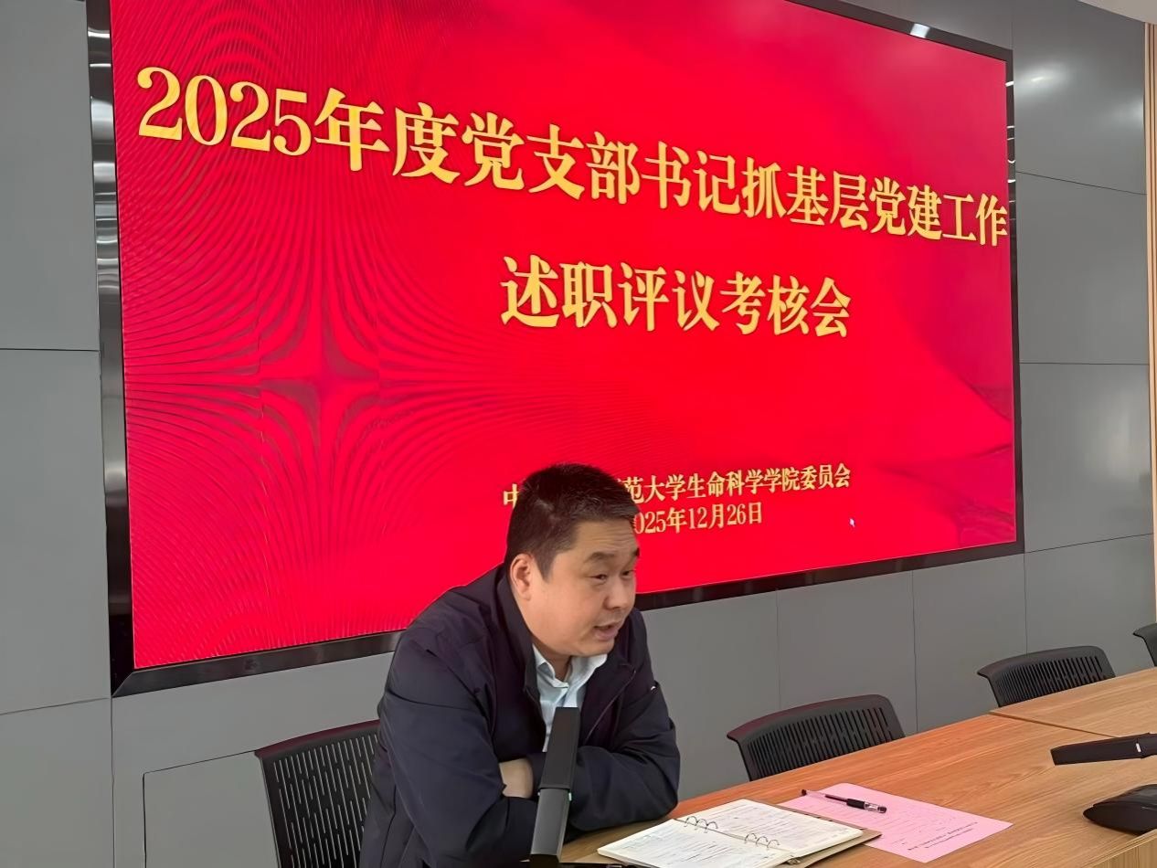 12月26日,生命科学学院党委召开2025年度党支部书记抓基层党建工作述职评议会,对各党支部书记全年工作进行“政治体检”,并对2026年度党建工作进行谋划部署。院党委书记郭飞出席会议并讲话,院党委委员、各党支部书记、师生党员代表参加会议。会议由专职辅导员郭彤主持。