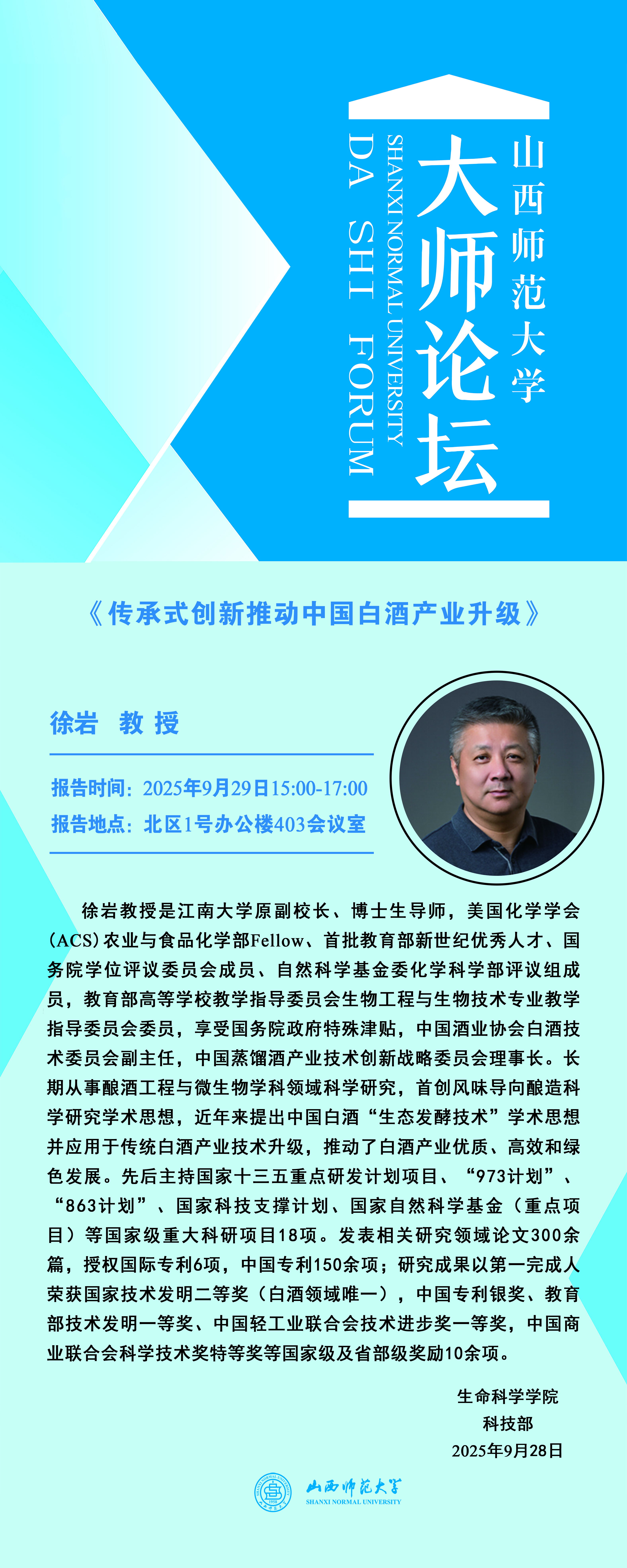 2025年9月29日,我院特邀江南大学徐岩教授,为广大师生分享题为《传承式创新推动中国白酒产业升级》的学术报告。